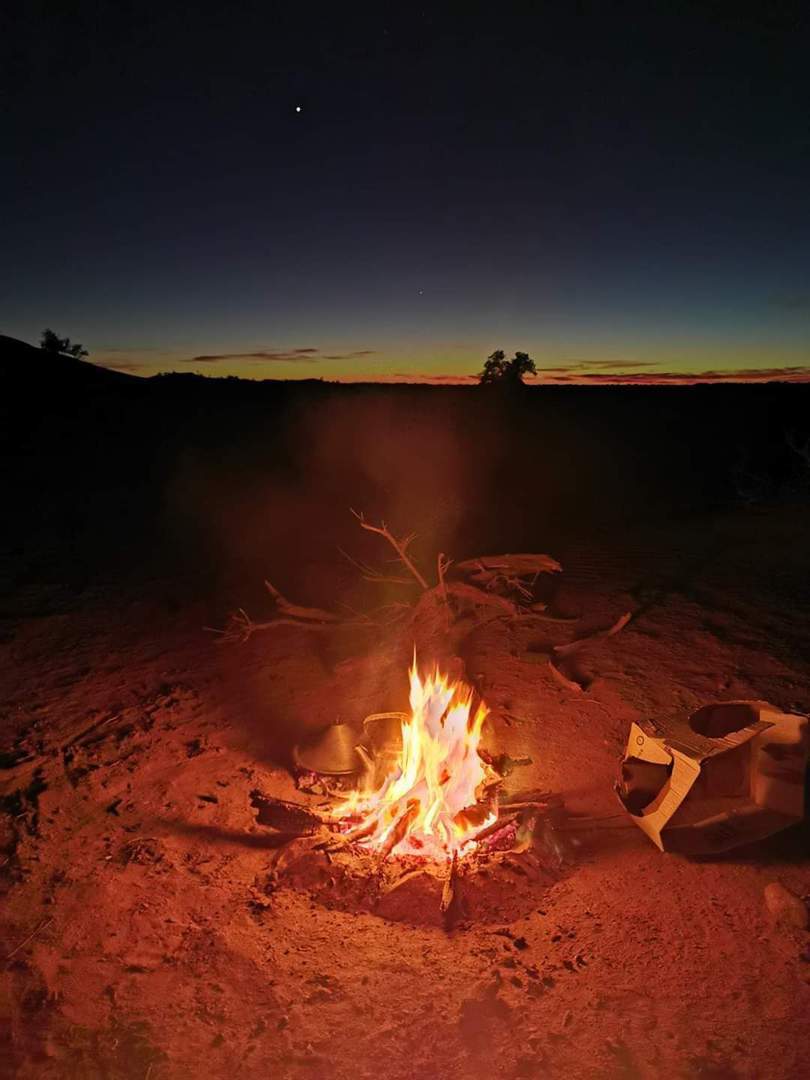 du camp pour la nuit. Soirée apaisante et thé à volonté autour du feu de bois.